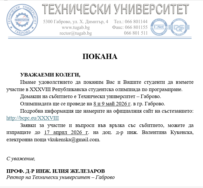Покана за участие в XXXVIII Републиканска студентска олимпиада по програмиране