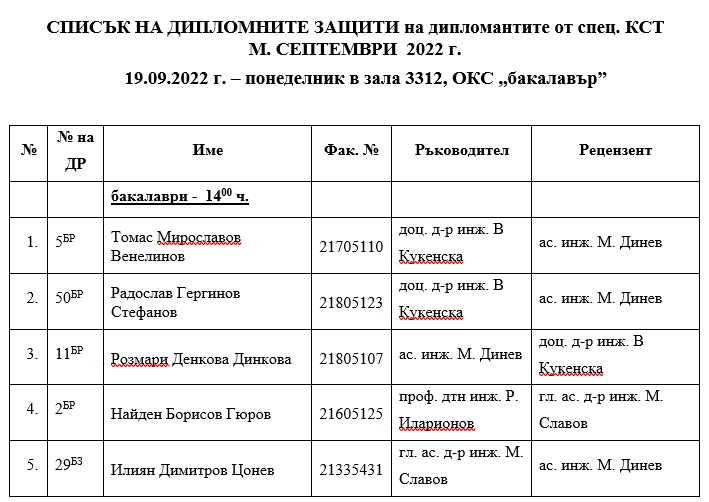 Разпределение на дипломни защити на спец. КСТ за 19.09.2022 г.