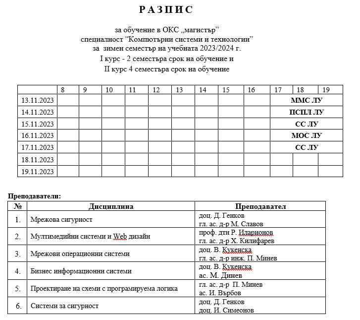 Разпис за ОКС "магистър"-I курс-2 сем. срок на обуч. и II курс-4 сем. обуч.- 6 седм.
