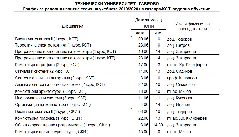 График за редовна изпитна сесия за месец Юни