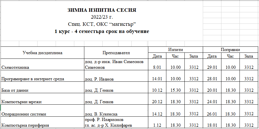 Зимна изпитна сесия на спец. КСТ, ОКС "магистър" -1 курс-4 семестъра срок на обучение