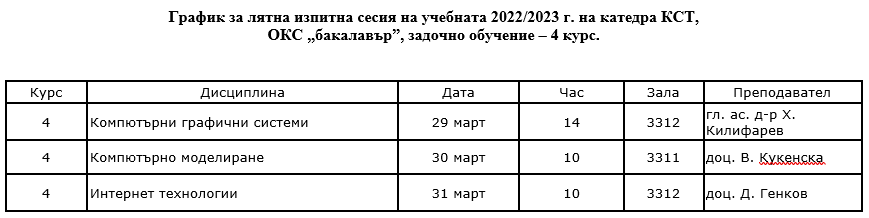 Лятна изпитна сесия за м. март на спец. КСТ, ОКС "бакалавър" - 4 курс, задочно обуч.