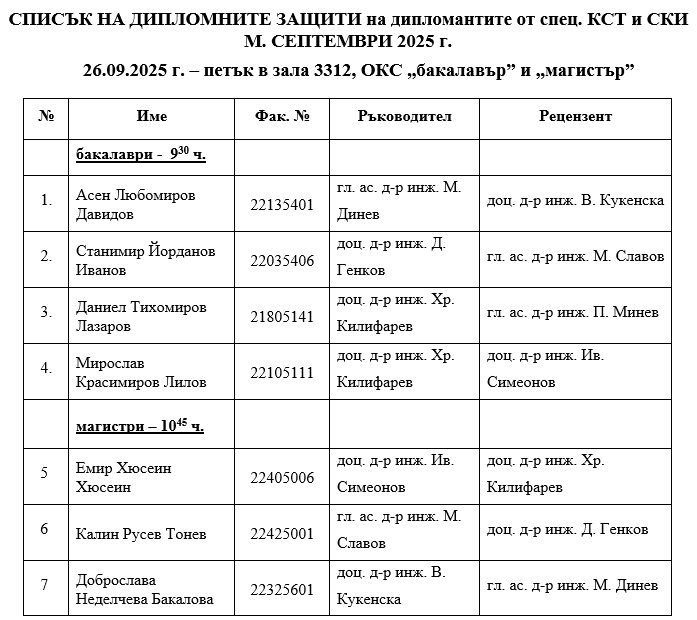 Разпределение на дипломни защити на спец. КСТ и СКИ за 26.09.2025 г.