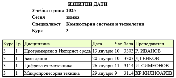 Зимна изпитна сесия на спец. КСТ - 3 курс, редовно обучение