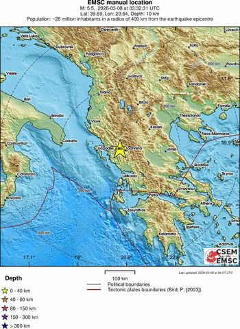 Земетресение с магнитуд от 5.5 по скалата на Рихтер е регистрирано в Гърция. Това съобщи Европейският средиземноморски сеизмологичен център.